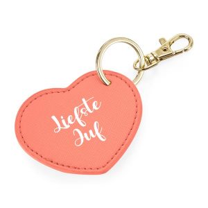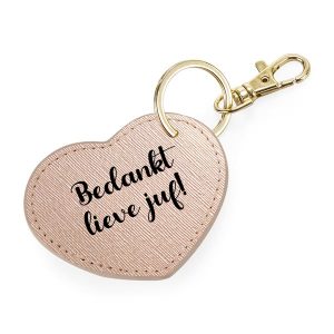 Sleutelhanger in de vorm van een hartje met opdruk naar keuze. Super leuk als einde schooljaar bedankje voor de juf, de sleutelhanger wordt daarom ook geleverd met de kaart “nummer één juf”.