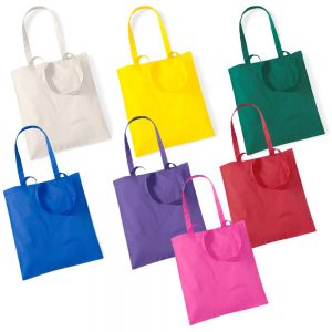 De tas is verkrijgbaar in verschillende kleuren met witte of zwarte opdruk.
